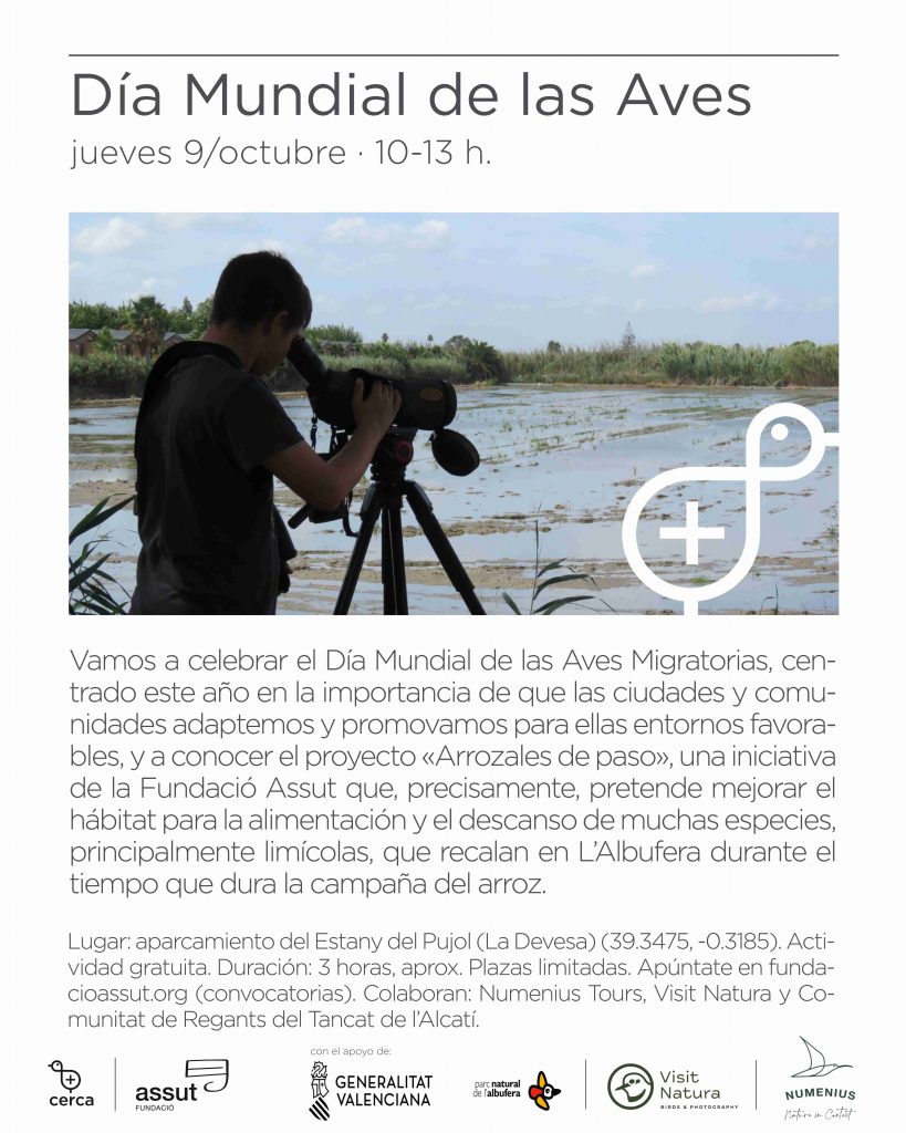 Vamos a celebrar el Día Mundial de las Aves Migratorias, centrado este año en la importancia de que las ciudades y comunidades adaptemos y promovamos para ellas entornos favorables, y a conocer el proyecto Arrozales de paso, una iniciativa de la Fundació Assut que, precisamente, pretende mejorar el hábitat para la alimentación y el descanso de muchas especies, principalmente limícolas, que recalan en L’Albufera durante el tiempo que dura la campaña del arroz.