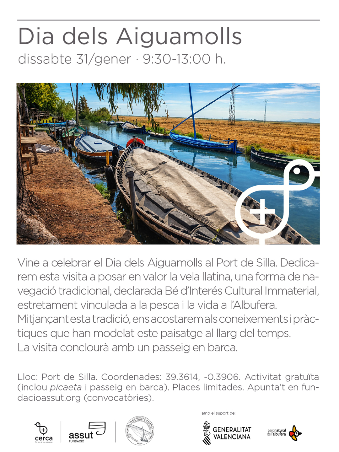 Vine a celebrar el Dia dels Aiguamolls al Port de Silla. Dedicarem esta visita a posar en valor la vela llatina, una forma de navegació tradicional, declarada Bé d’Interés Cultural Immaterial, estretament vinculada a la pesca i la vida a l’Albufera. Mitjançant esta tradició, ens acostarem als coneixements i pràctiques que han modelat este paisatge al llarg del temps. La visita conclourà amb un passeig en barca.