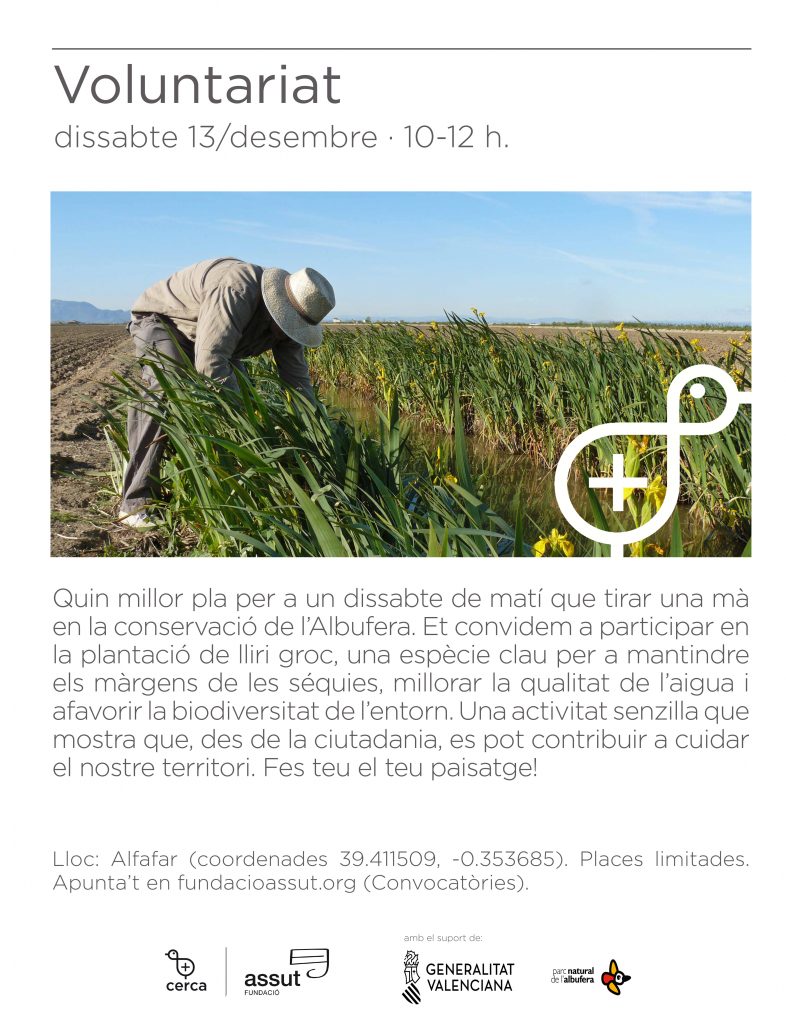 Quin millor pla per a un dissabte de matí que tirar una mà en la conservació de l’Albufera. Et convidem a participar en la plantació de lliri groc, una espècie clau per a mantindre els màrgens de les séquies, millorar la qualitat de l’aigua i afavorir la biodiversitat de l’entorn. Una activitat senzilla que mostra que, des de la ciutadania, es pot contribuir a cuidar el nostre territori. Fes teu el teu paisatge!