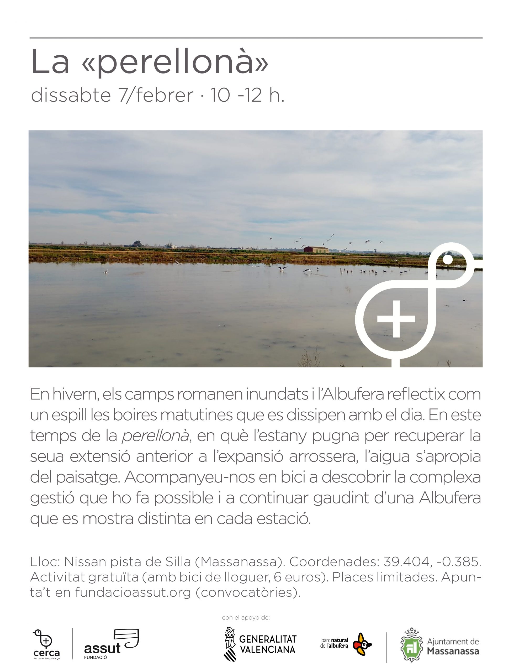 En hivern, els camps romanen inundats i l’Albufera reflectix com un espill les boires matutines que es dissipen amb el dia. En este temps de la perellonà, en què l’estany pugna per recuperar la seua extensió anterior a l’expansió arrossera, l’aigua s’apropia del paisatge. Acompanyeu-nos en bici a descobrir la complexa gestió que ho fa possible i a continuar gaudint d’una Albufera que es mostra canviant i distinta en cada estació.